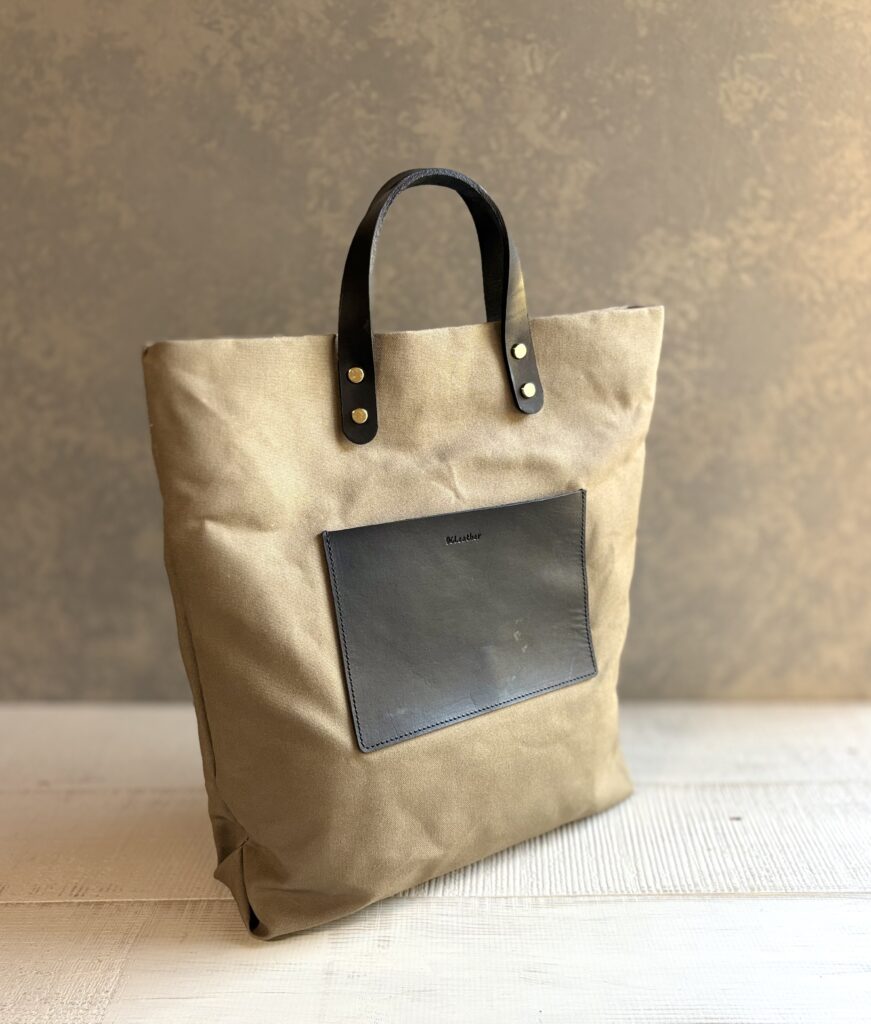 一般的な帆布とは違い、撥水加工などを施した丈夫なパラフィン帆布を使用したバッグで、黒の持ち手と外ポケット付きでのオーダーです。
