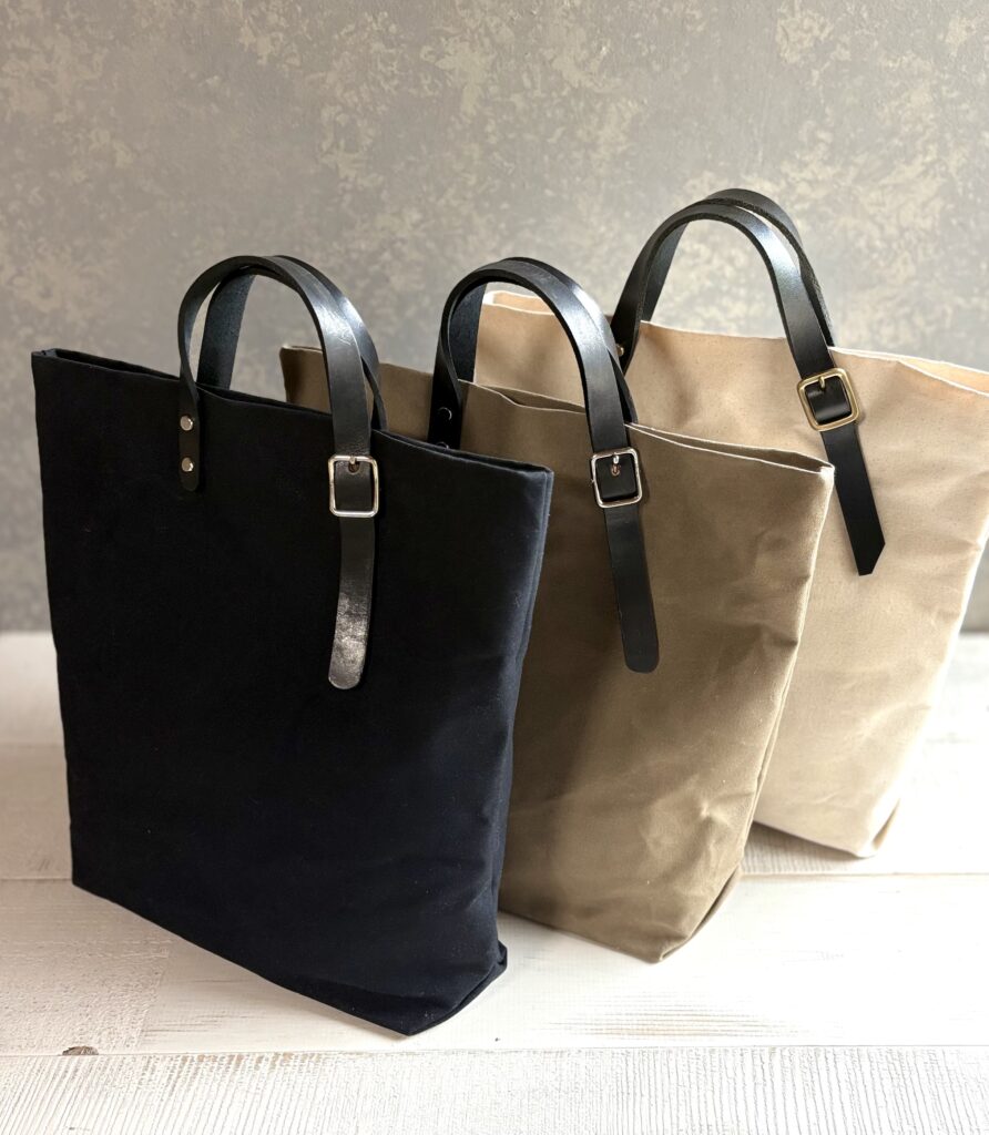 今回のイベントでは、ディアスキン(鹿革)やパラフィン加工の帆布+柿渋染めの内装で仕上げた新作バッグをメインに、その他お財布などの定番商品も販売します。